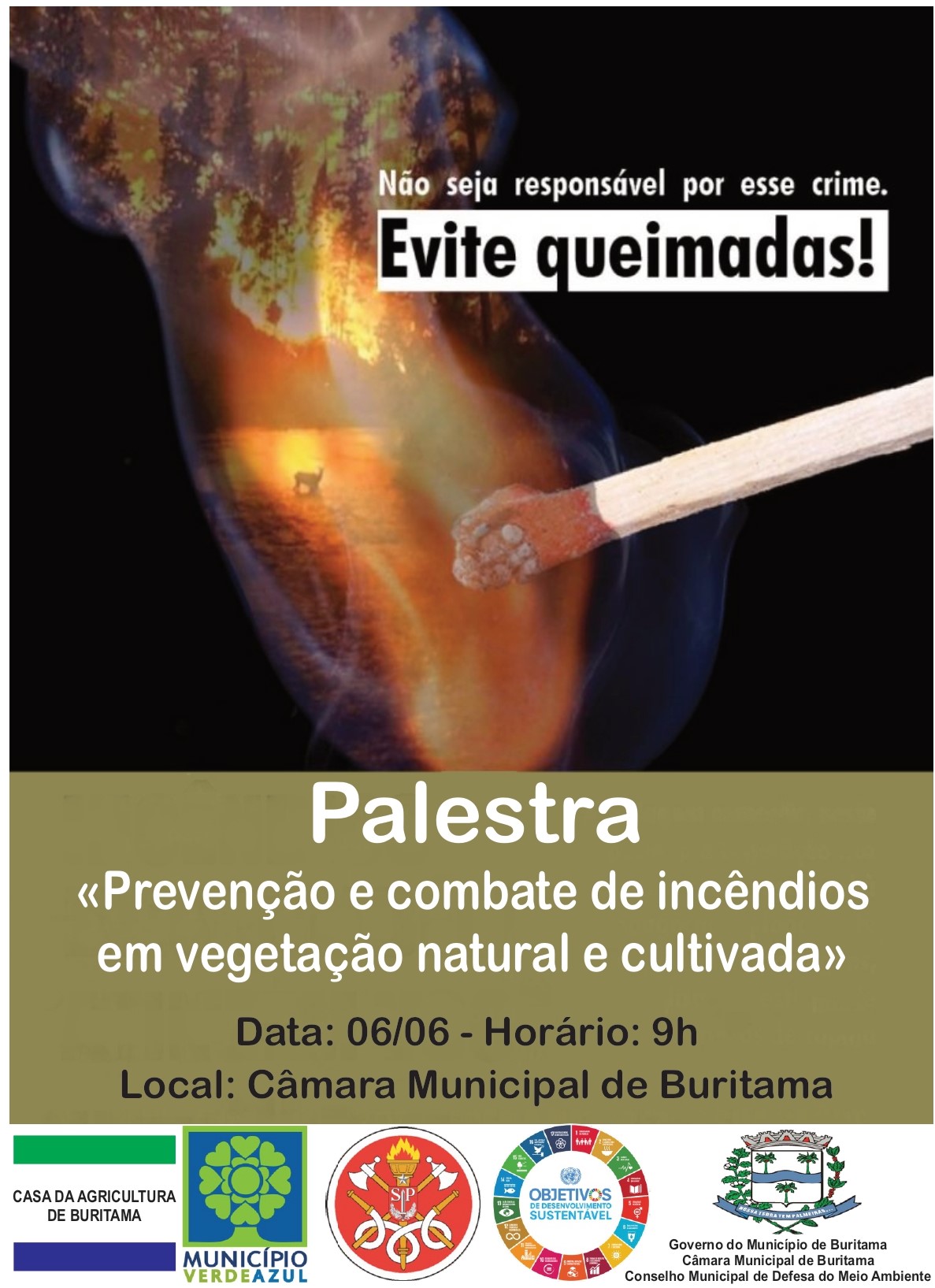 A palestra “Prevenção e combate de incêndios em vegetação natural e cultivada” é tema importante para início da seca no interior paulista. O evento será coordenado pelo soldado da Polícia Militar, Ulisses Scacalossi Athayde, responsável pela Base Comunitária do Corpo de Bombeiros de Buritama, em parceria com a Casa da Agricultura. A palestra acontece no dia 6 de junho, a partir das 9h, na Câmara Municipal.